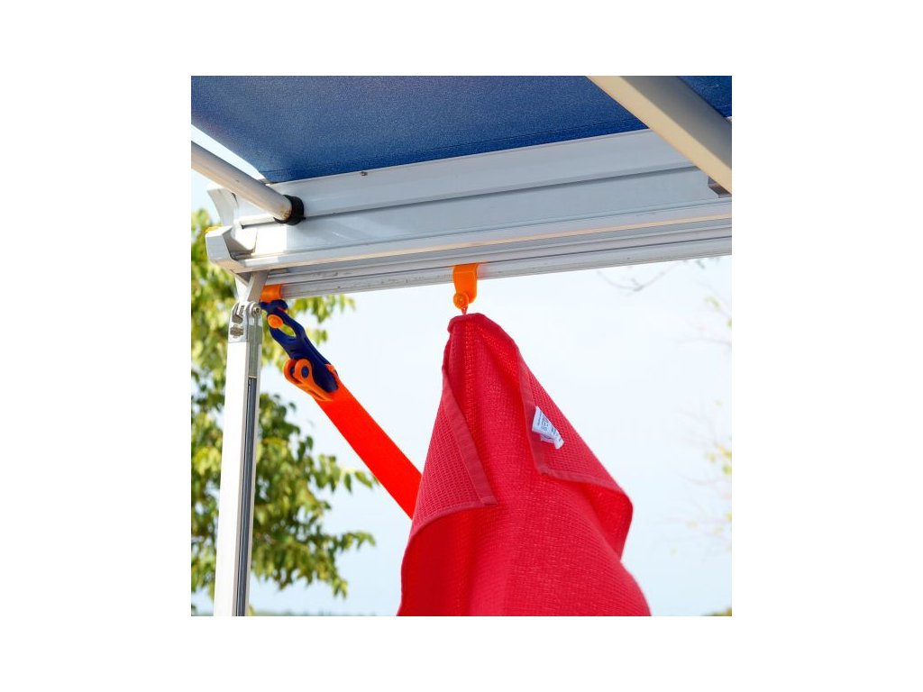 Croc-Adapter je chytrý univerzální držák, který zasunete do keder lišty markýzy (7 mm) nebo obytného přívěsu (10 mm) a můžete na něj pohodlně zavěsit popruhy, utěrky, osvětlení i tvorbu stínění. Skládá se z pružného oranžového těla a modrých aretačních vložek pro bezpečné uchycení.