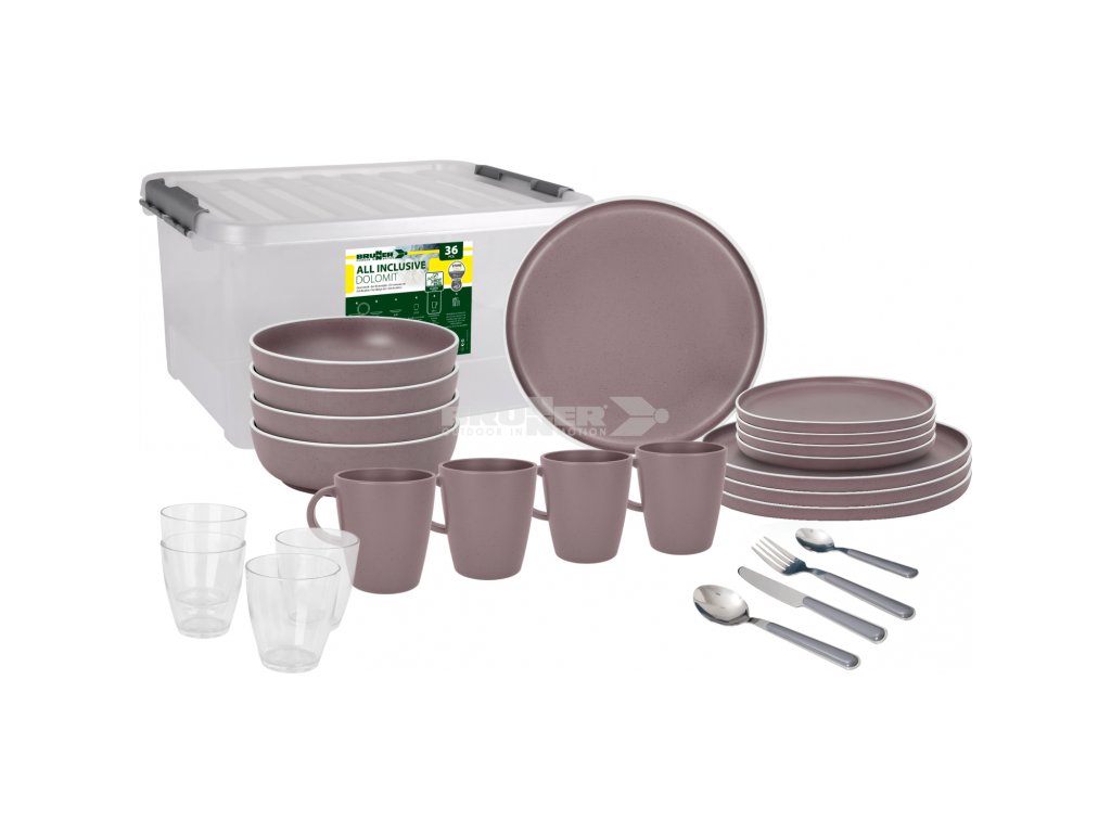 Stylové stolování kdekoli na cestách? Se sadou All Inclusive Dolomit Rosè to není problém. Tato 36dílná sada kombinuje jemnou růžovou barvu s elegantním leskem a vysokou odolností. Díky materiálu STONETOUCH (melamin s minerálními příměsemi) vypadá jako porcelán, ale je nerozbitná a lehká.