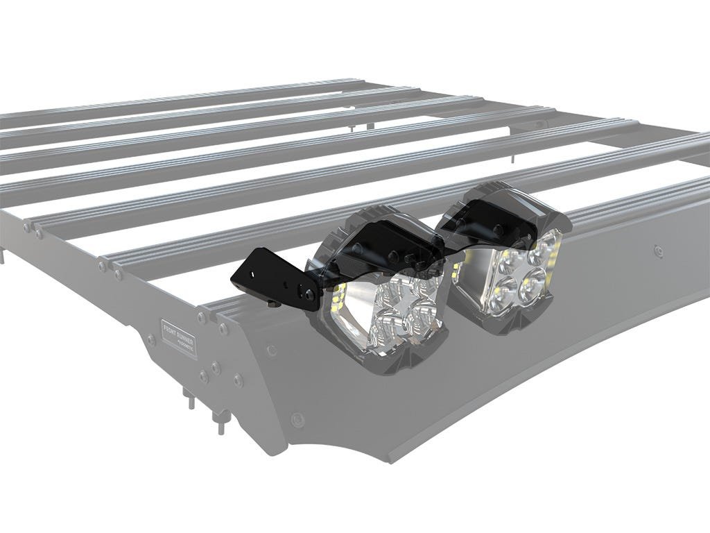 Dvojice držáků umožňuje bezpečné uchycení světelného modulu Baja Designs LP4 na střešní nosič Front Runner Slimsport (pomocí větrného deflektoru pro světelnou lištu) nebo na Slimpro Van Rack.