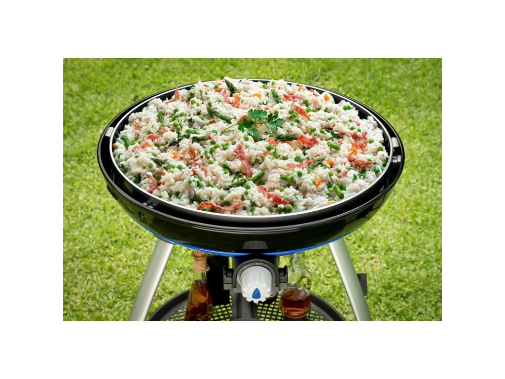 Pánev je ideální pro přípravu paelly, rizota, těstovin, zeleniny i klasických snídaní. Na grilu se používá jako samostatná varná plocha – položte ji na hořákovou část tak, aby bezpečně dosedla do vodítek v misce na tuk. Lze ji použít i na jiném plynovém vařiči (dle rozměru a stability).
