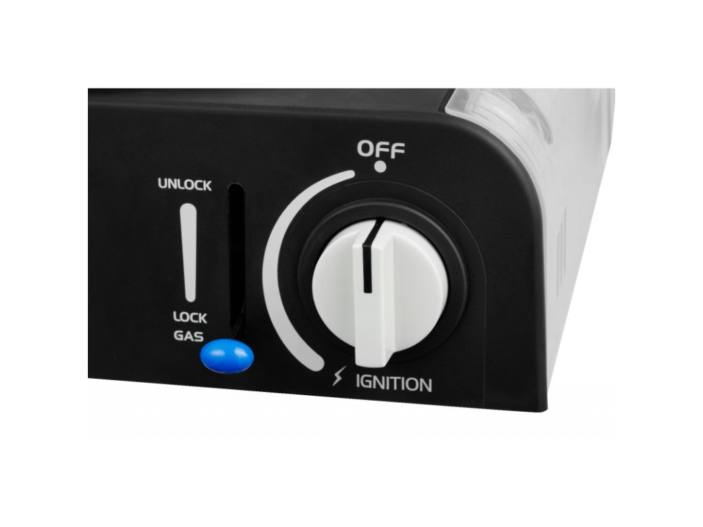 Použití je velmi jednoduché – kartuši stačí vložit do grilu, zajistit pomocí páčky a otočením ovládacího knoflíku začít vařit. Automatické zapalování zajišťuje pohodlný start bez potřeby zápalek.