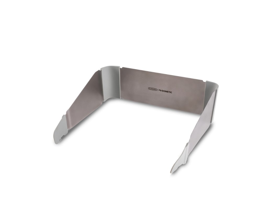 Součástí grilu je také ochranný štít proti větru a odstřiku mastnoty, který chrání plamen a zároveň pomáhá udržet okolí varné plochy čisté – ideální řešení při vaření venku i uvnitř dodávky.