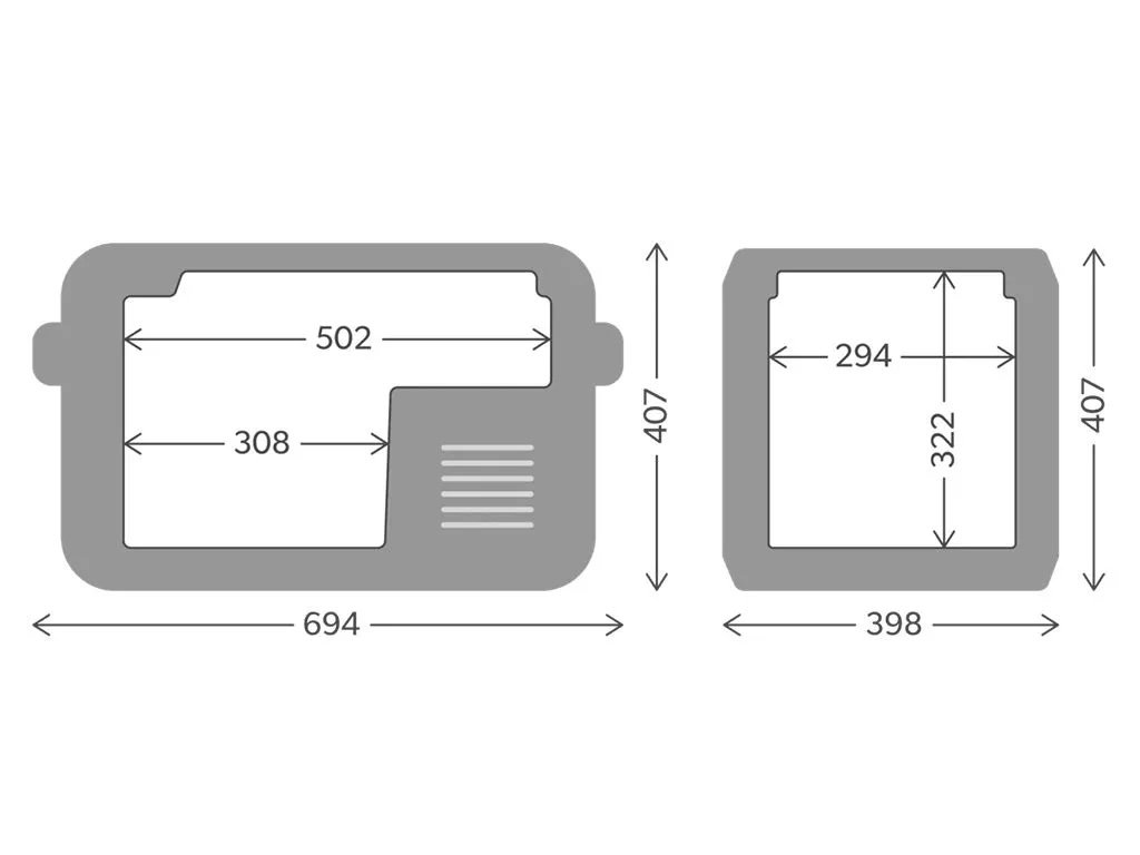 694 mm (27,32") délka × 398 mm (15,67") šířka × 407 mm (16,02") výška