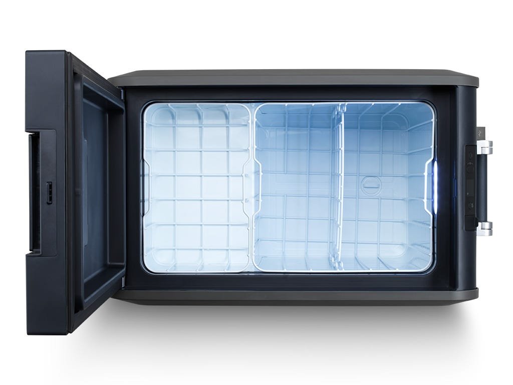 Vnitřní vybavení zahrnuje vyjímatelnou kovovou přepážku a vnitřní LED osvětlení.
