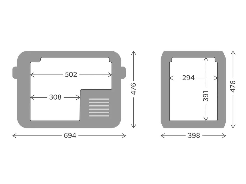 694 mm (27,32") D × 398 mm (15,67") Š × 476 mm (18,74") V