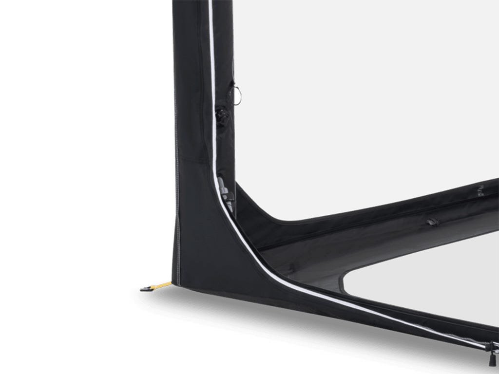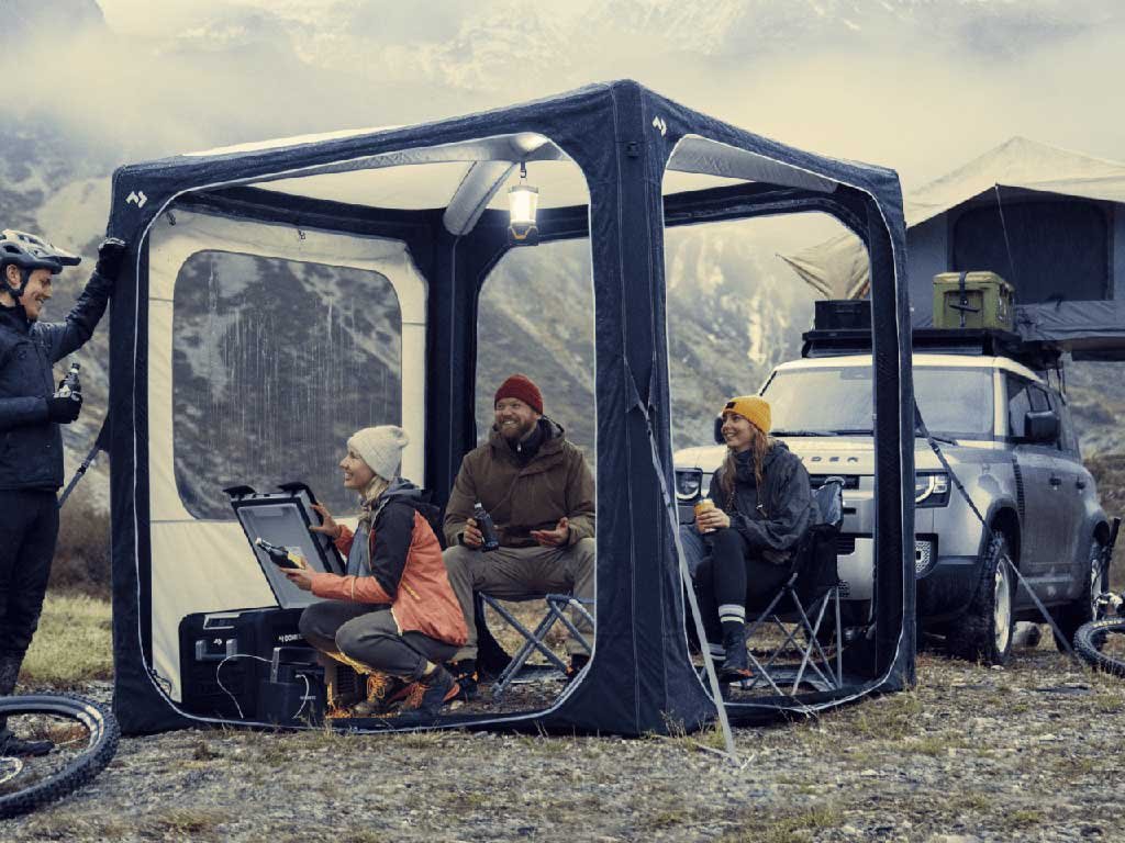 Samostatně stojící nafukovací přístřešek o rozměrech 2,3 × 2,3 m, který lze rychle postavit, nebo jej pomocí zipového uzávěru připojit k vašemu SUV či obytnému vozu.