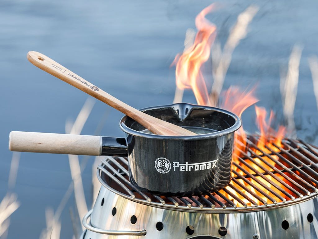 Dřevěná rukojeť slouží jako přirozený tepelný štít a usnadňuje manipulaci nad ohněm.