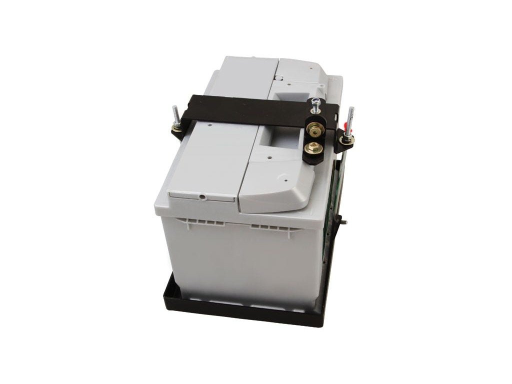 Univerzální držák baterie pro bezpečné upevnění 70A baterie. Součástí balení jsou všechny díly potřebné k montáži. Držák je vyrobený z vysokopevnostní oceli a opatřený černým práškovým lakem.