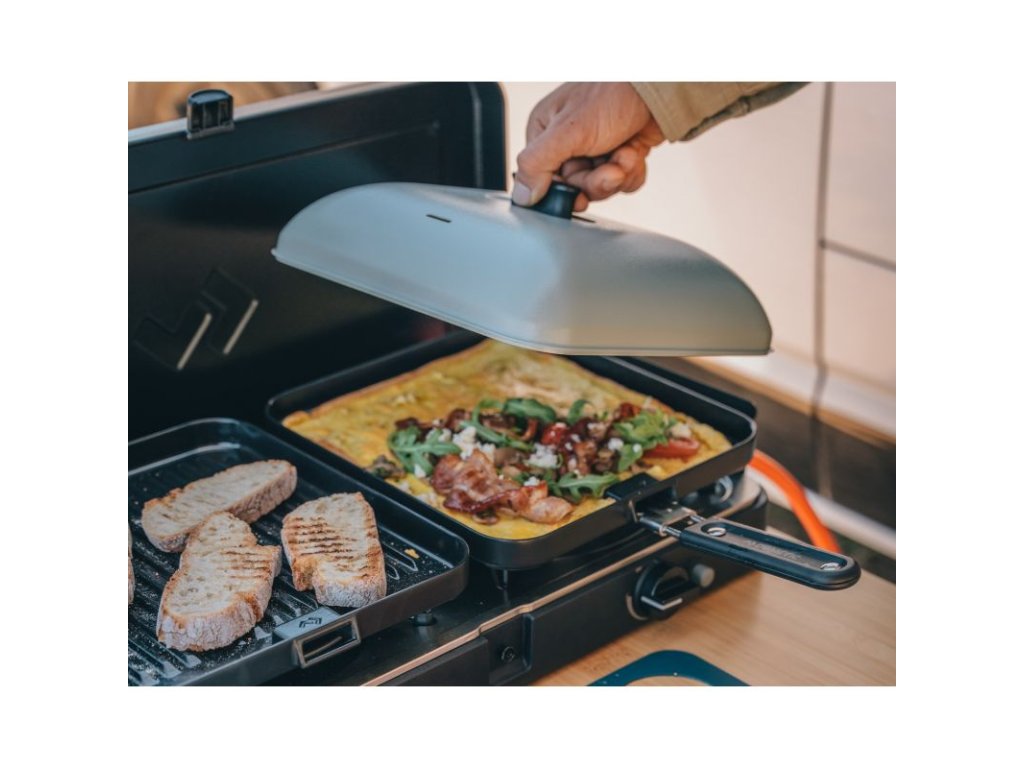 Poklop vytváří uzavřený prostor podobný troubě, který výrazně zlepšuje udržení tepla a umožňuje rovnoměrné propečení pokrmů. Zároveň omezuje rozstřikování tuku a šťáv, čímž udržuje vařič i okolí čistší.