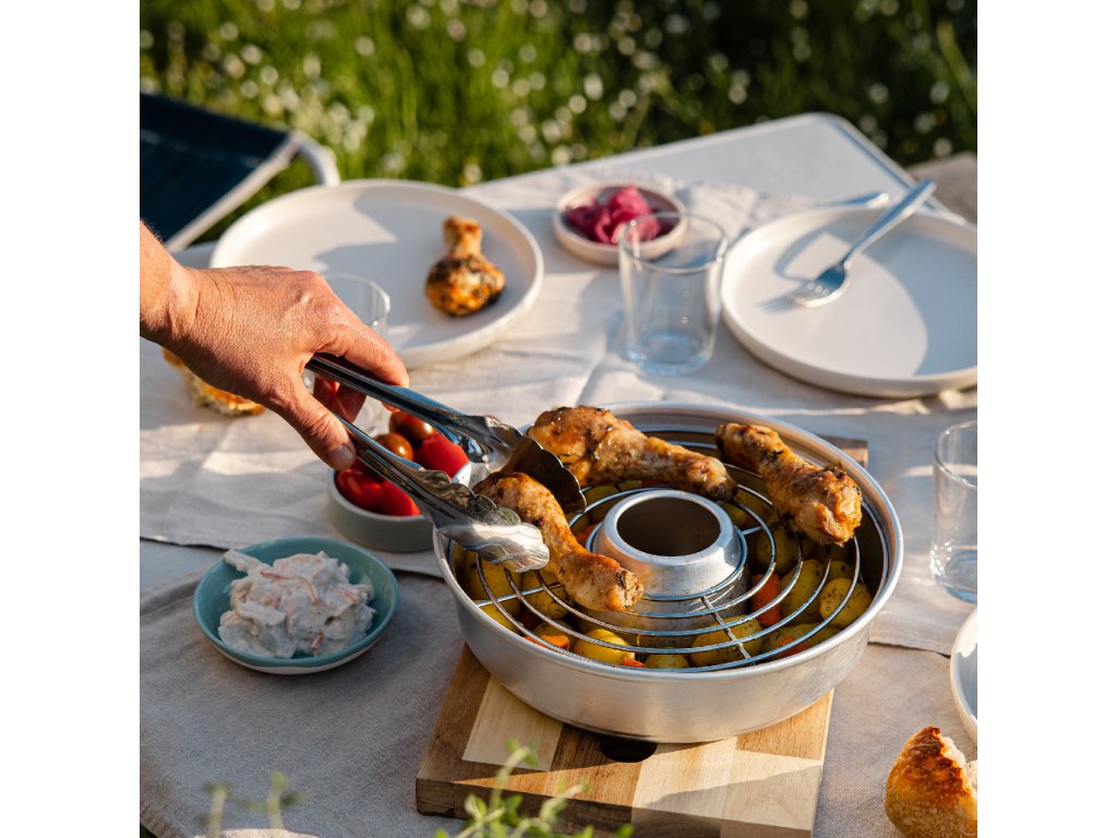 Díky hornímu roštu můžete snadno kombinovat různé chutě a připravit celé jídlo v jedné nádobě. Zatímco dole pečete zeleninu nebo zapečené brambory, nahoře se prohřívají klobásky, kuře, chléb nebo zelenina na páře. Navíc šťáva a koření z horních surovin obohatí chuť spodního jídla – praktické, efektivní a velmi chutné.