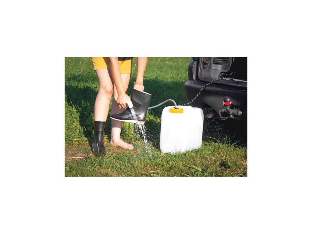 Jednoduše zapojíte kabel do 12V zásuvky, vytáhnete hadici z kanystru, posunete páčku na ruční sprše a voda začne téct. Zavření probíhá zpětným pohybem páčky. Vše je kompaktně uschováno v odolné plastové nádobě, kterou snadno převezete a uložíte.
