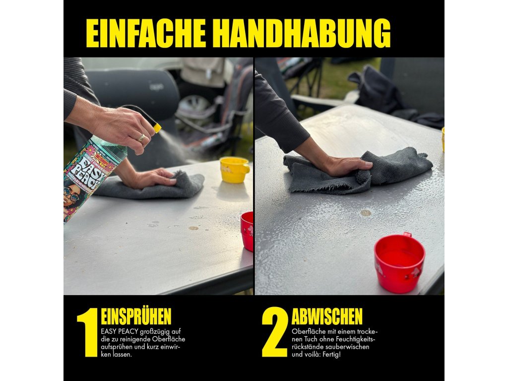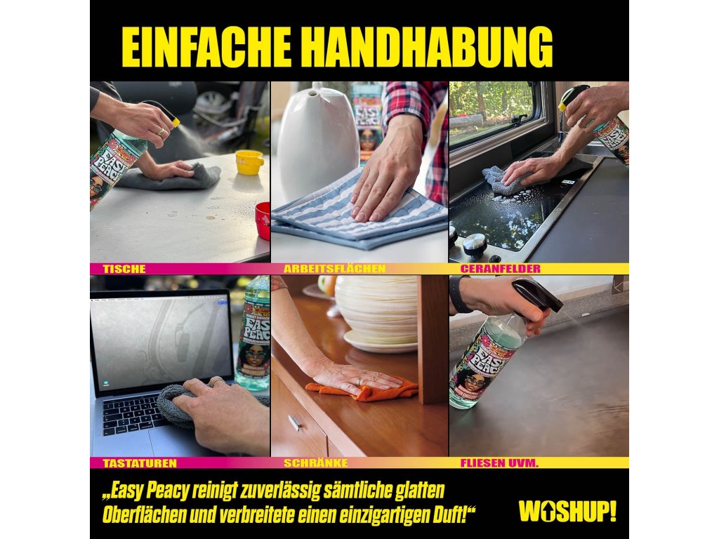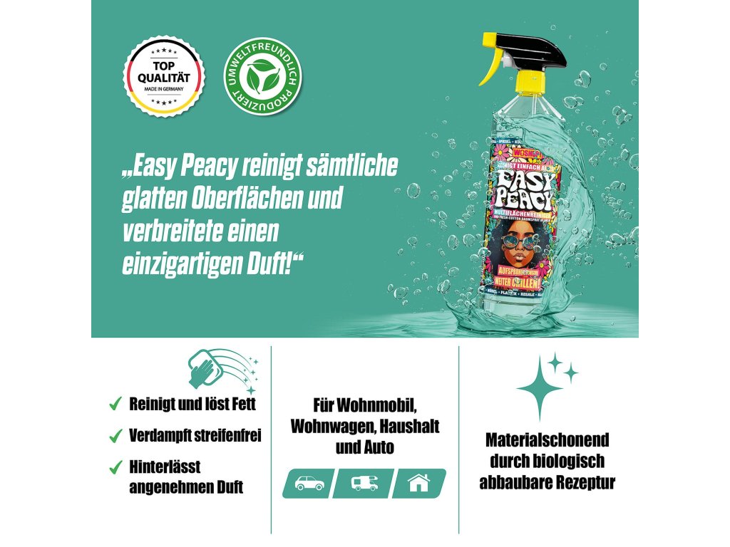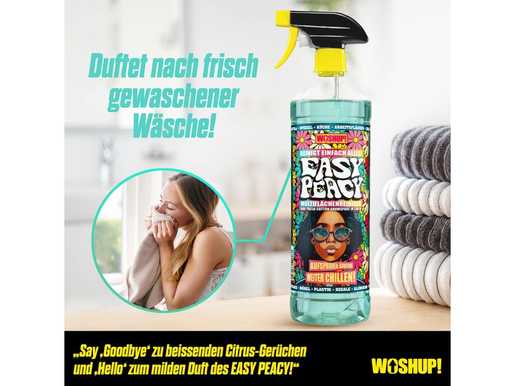 More flower, more power! Easy Peacy od Woshup je univerzální čistič, který zvládne rychlý i důkladný úklid všude tam, kde se žije a cestuje – v camperu/karavanu, doma v kuchyni, ve sdíleném ubytování nebo klidně i na festivalu. Už žádný chaos specializovaných přípravků: Easy Peacy šetří místo, čas i peníze.