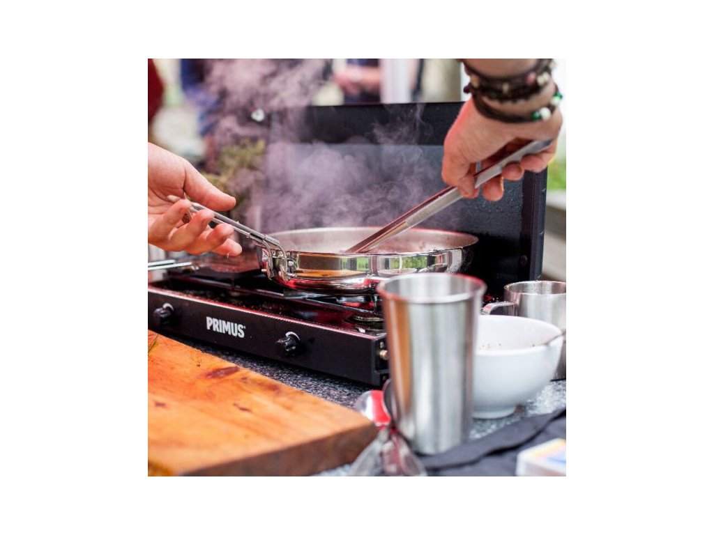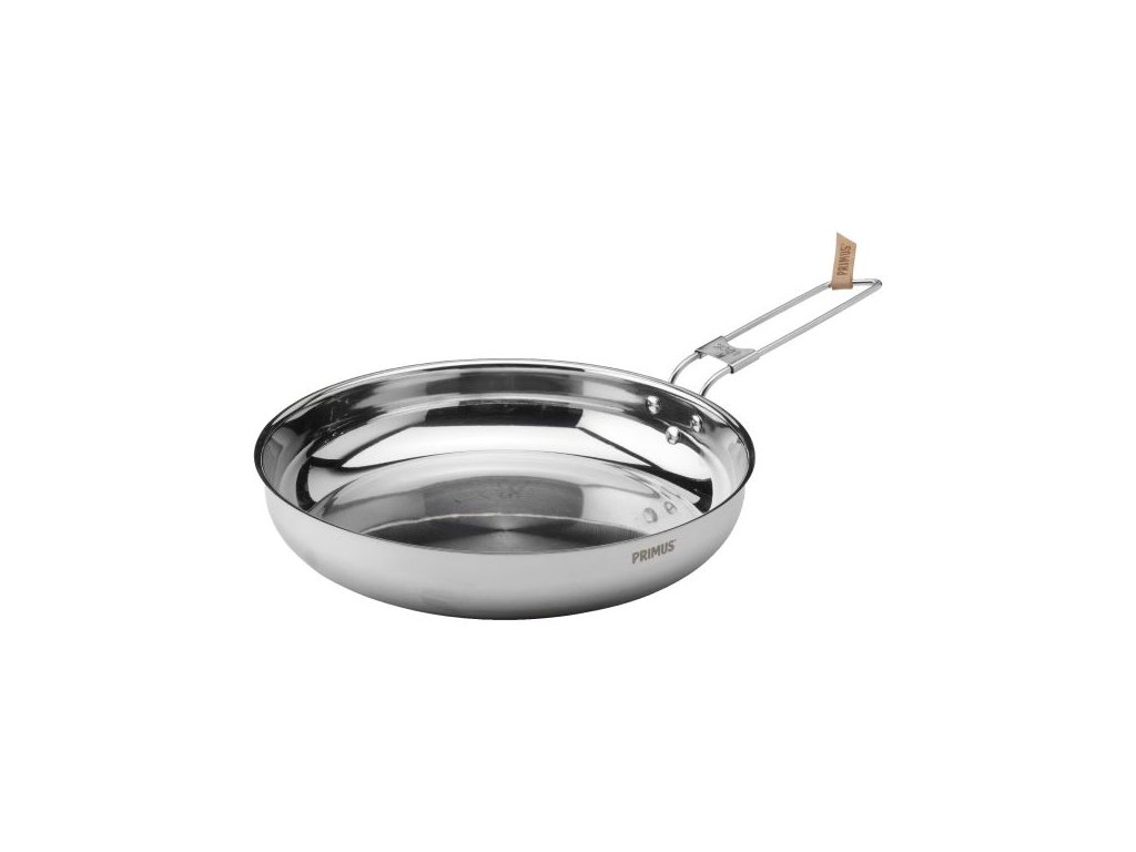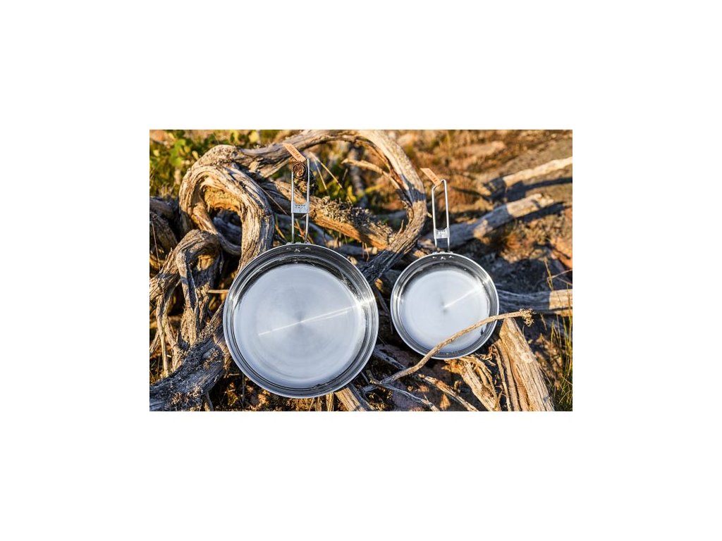 Vysoce odolná pánev vyrobená z leštěné nerezové oceli 18/8 s hliníkovým jádrem pro rovnoměrné rozložení tepla. Vhodná pro použití na plynovém vařiči i nad otevřeným ohněm – ideální řešení pro kempování, táboření nebo vaření v přírodě.