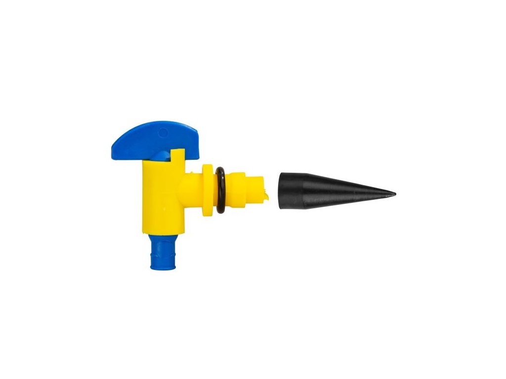 Instalace je velmi jednoduchá a nevyžaduje žádné speciální nářadí. Stačí ventil umístit k těsnění (O-kroužku) výpustného kohoutu a instalační špičkou propíchnout stěnu kanystru. Špička zapadne dovnitř a ventil zůstane bezpečně usazený na svém místě.