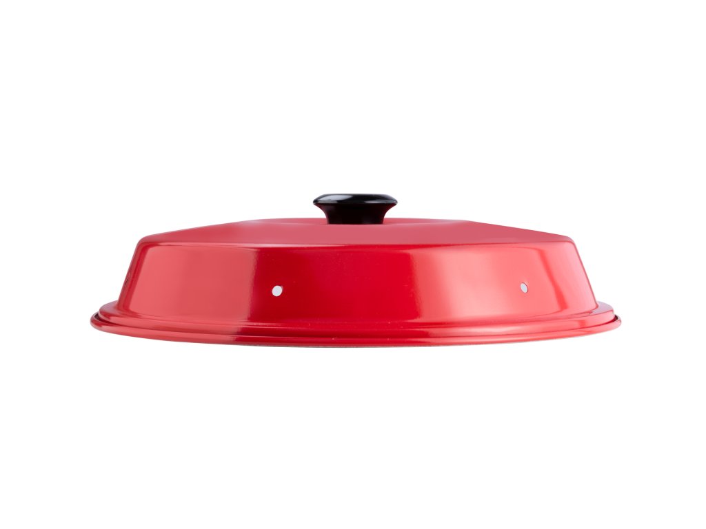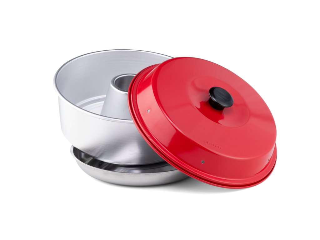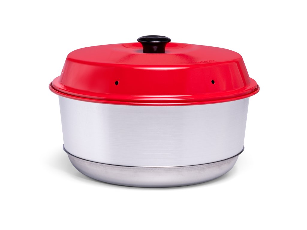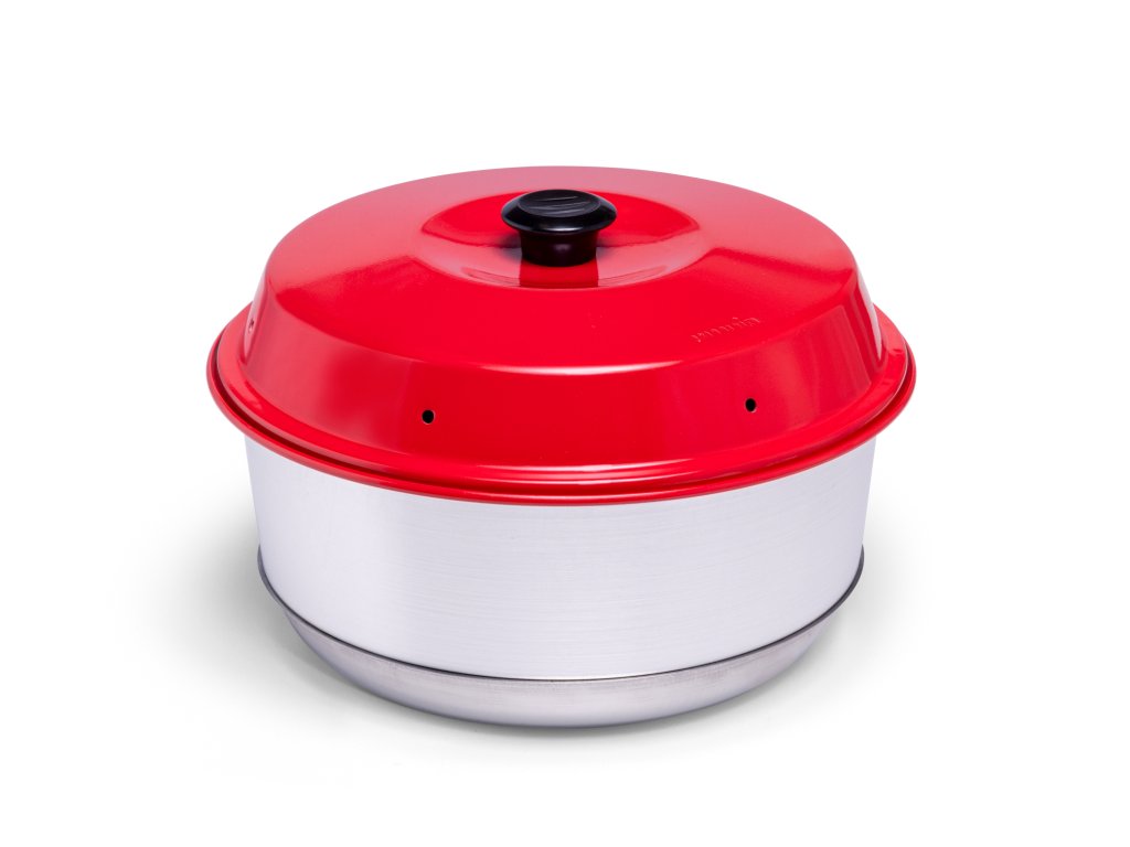 - Červené víko s ventilačními otvory pro rovnoměrné pečení