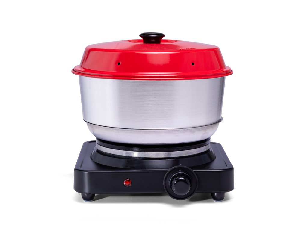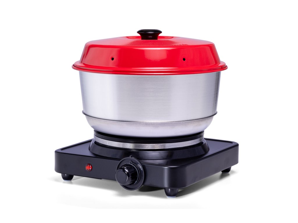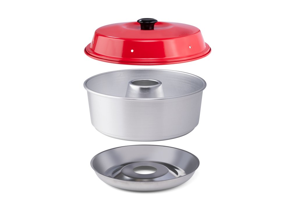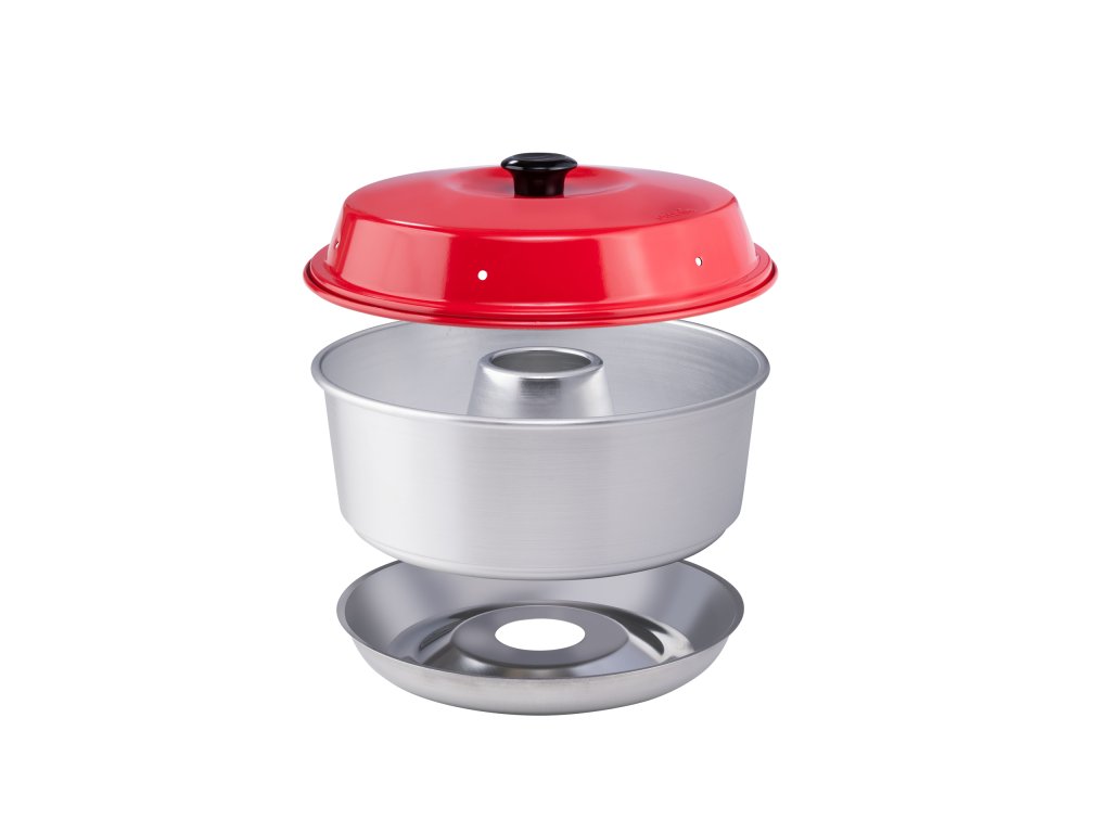 - Červené víko s ventilačními otvory pro rovnoměrné pečení