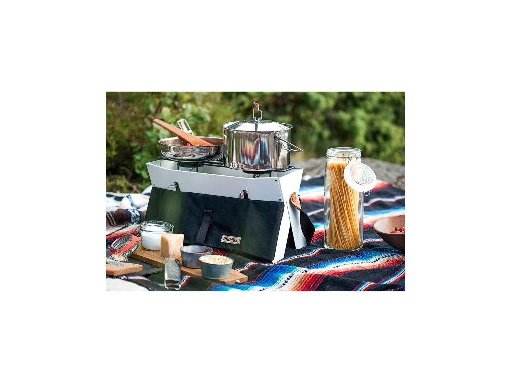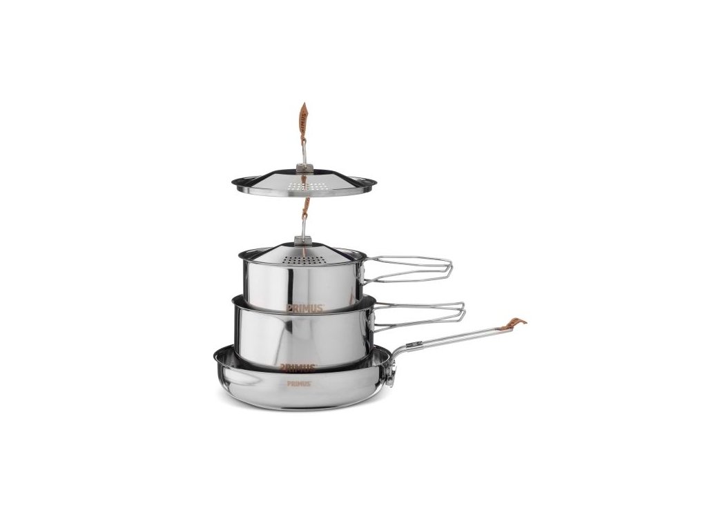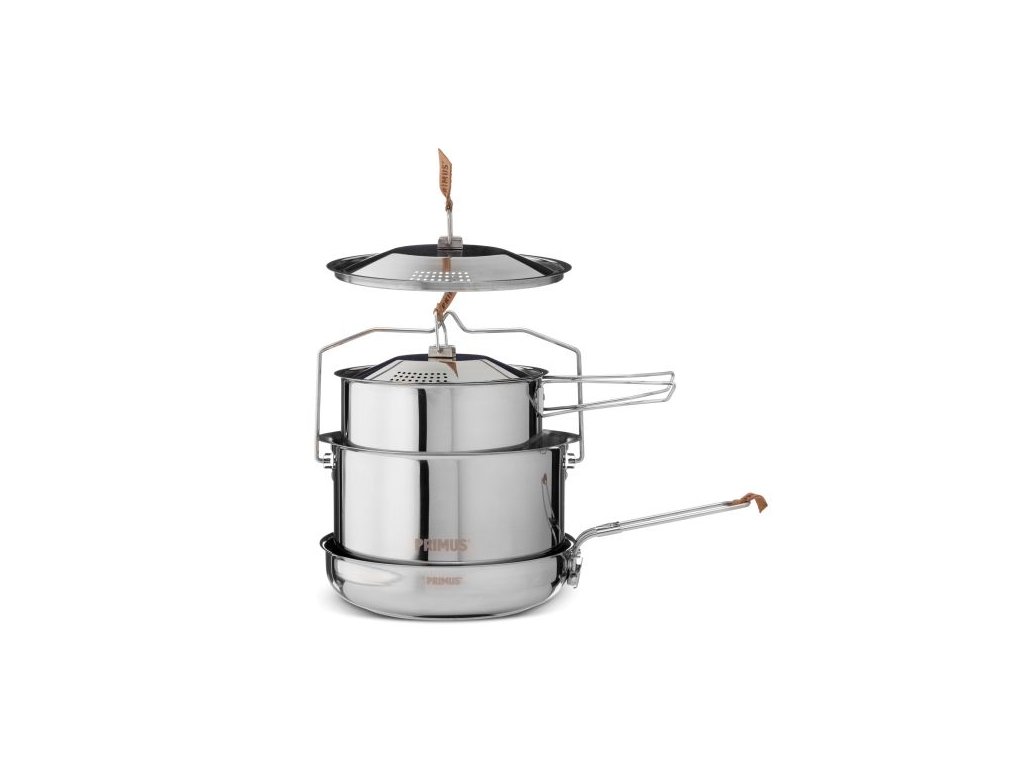 Vařicí sada od švédské značky Primus je vyrobena z odolné nerezové oceli 18/8 a navržena pro maximální životnost i při častém používání v terénu. Díky skládacím madlům a stohovatelnému designu ji snadno uložíte do přiloženého přepravního obalu, čímž šetříte místo ve výbavě.