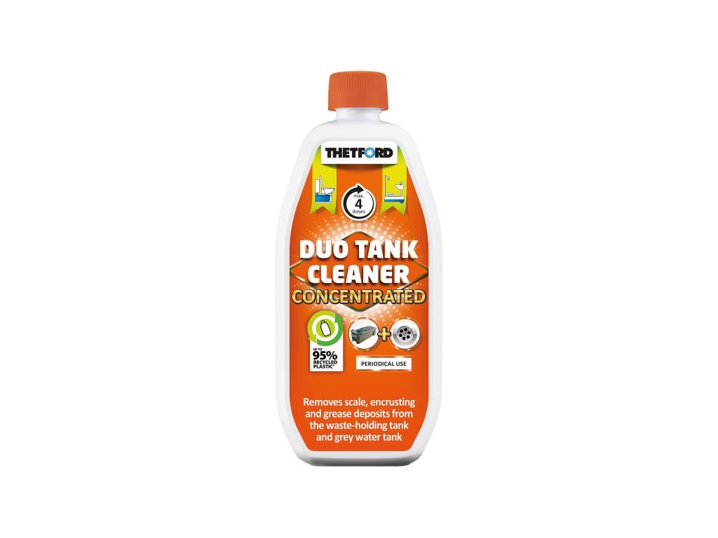 Výkonný koncentrovaný čistič Thetford Duo Tank Cleaner udržuje odpadní kazety i nádrže na šedou vodu v perfektní kondici. Efektivně odstraňuje vodní kámen, mastnotu a organické nečistoty bez nutnosti drhnutí. Díky šetrnému složení nepoškozuje vnitřní technické součásti nádrží a zanechává svěží citrusovou vůni.