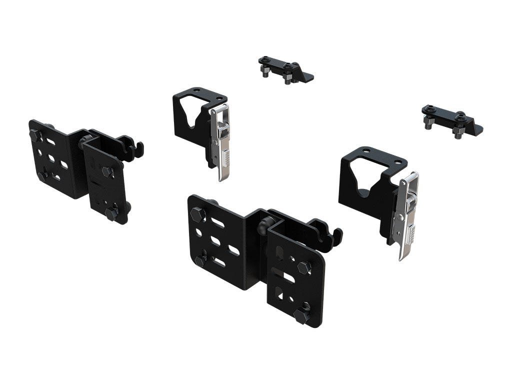 Dva nízkoprofilové základní držáky se přišroubují na nosič Front Runner, zatímco dvě samonaváděcí pouzdra se pomocí přiloženého spojovacího materiálu připevní na montážní lištu markýzy.