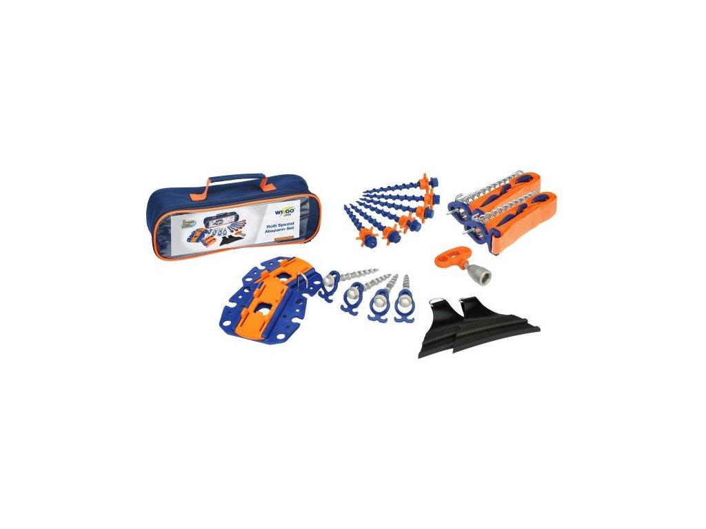 Sada obsahuje 2 kotvící destičky Fix&Go Anchor Plate 2.0, 6 šroubovacích úchytů Peg&Stop s pojistnou maticí, 4 odolné úderové šroubovací kolíky Hardcore Peggy a napínací materiál pro vytvoření protitahu mezi markýzou a zemí.