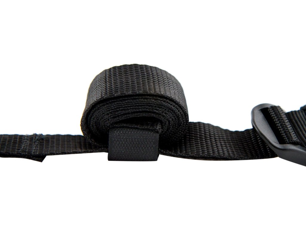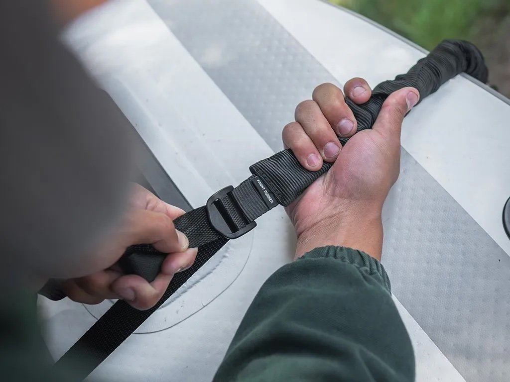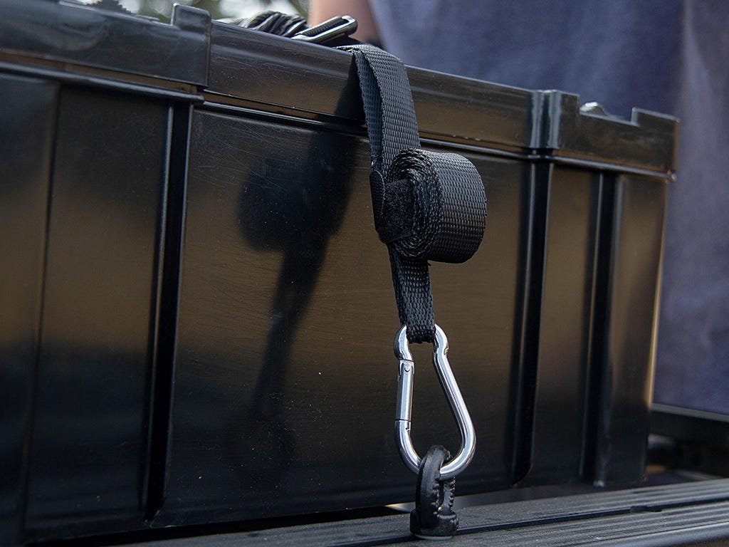 Háček připevněte k okům Black Tie Down Rings / Eye Nuts nebo k nerezovým úchytům Front Runner střešního nosiče. Lze také obepnout příčku nebo boční profil a popruh uchytit zpět k sobě.