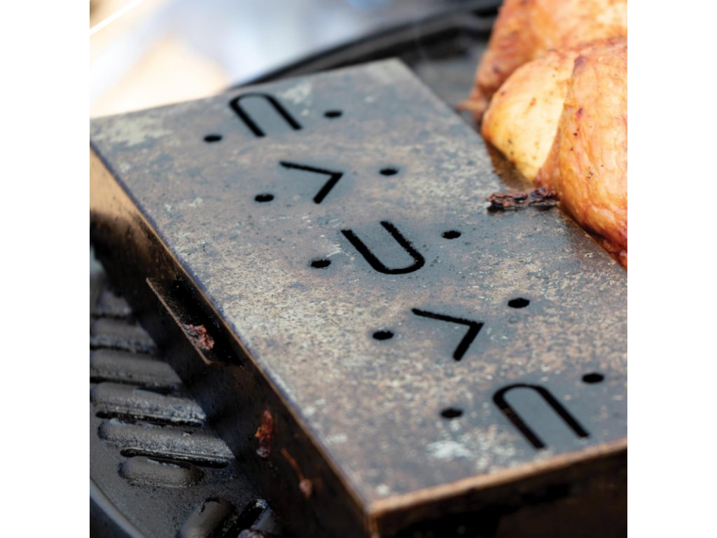 Box je vyroben z kvalitní tlustostěnné nerezové oceli, která zajišťuje dlouhou životnost, odolnost vůči vysokým teplotám a snadné čištění. Díky kompaktním rozměrům pojme ideální množství dřevěných štěpek pro rovnoměrné uzení.