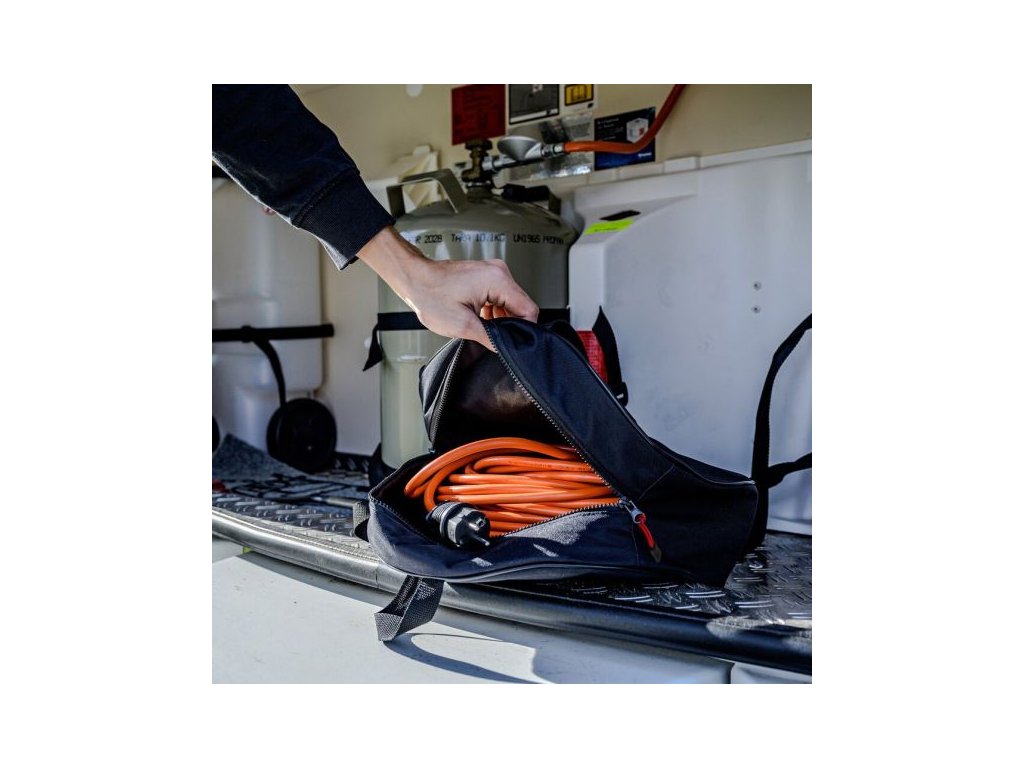 Díky dvoucestnému zipu s táhly lze tašku snadno otevřít z obou stran, což usnadňuje manipulaci a přístup k uloženému obsahu. Její rozměry jsou navrženy tak, aby se do ní pohodlně vešlo příslušenství jako kabely, hadice, kolíky ke stanu nebo jiné vybavení, které chcete mít přehledně uloženo a chráněno.