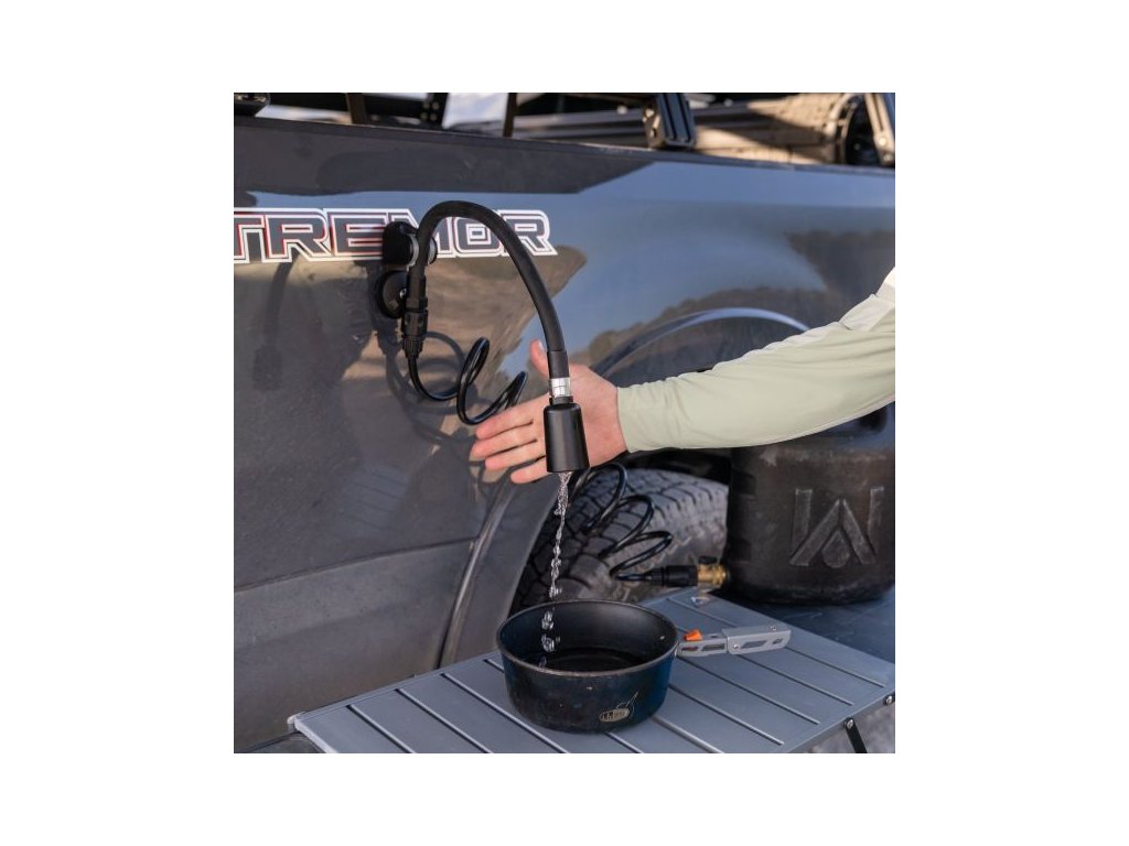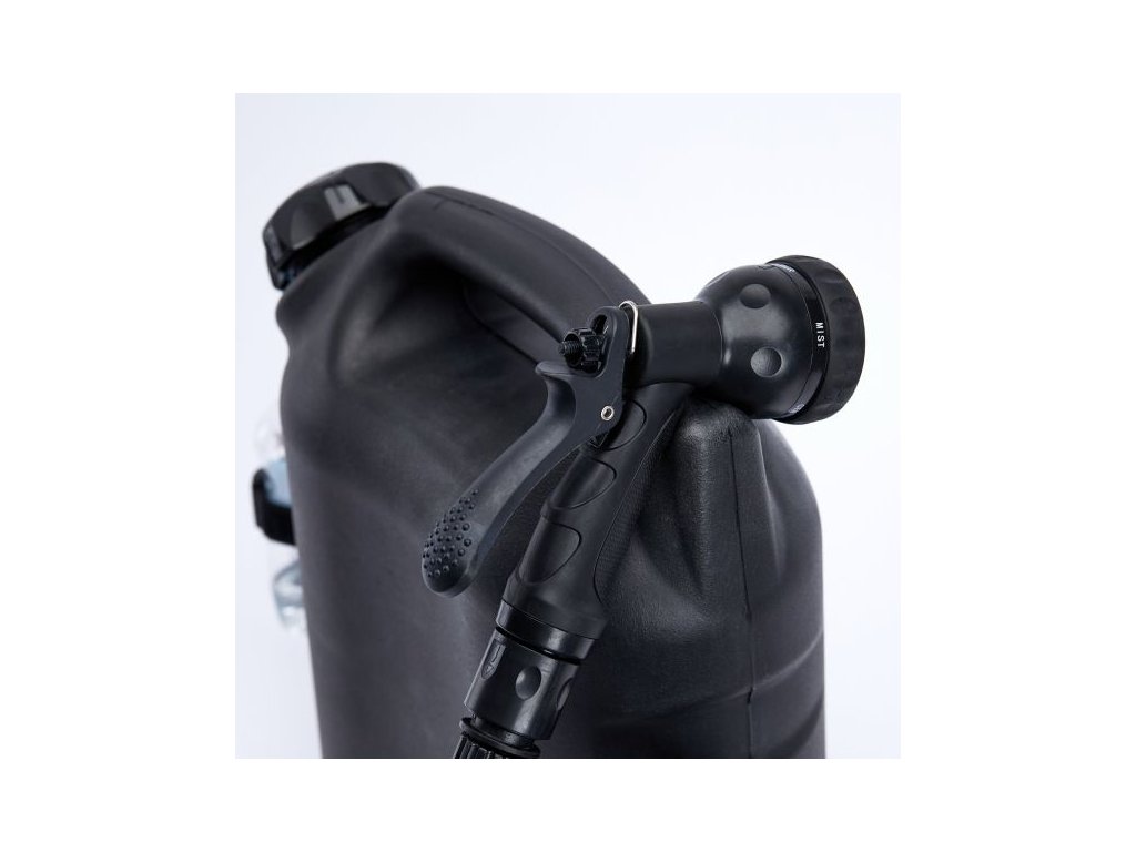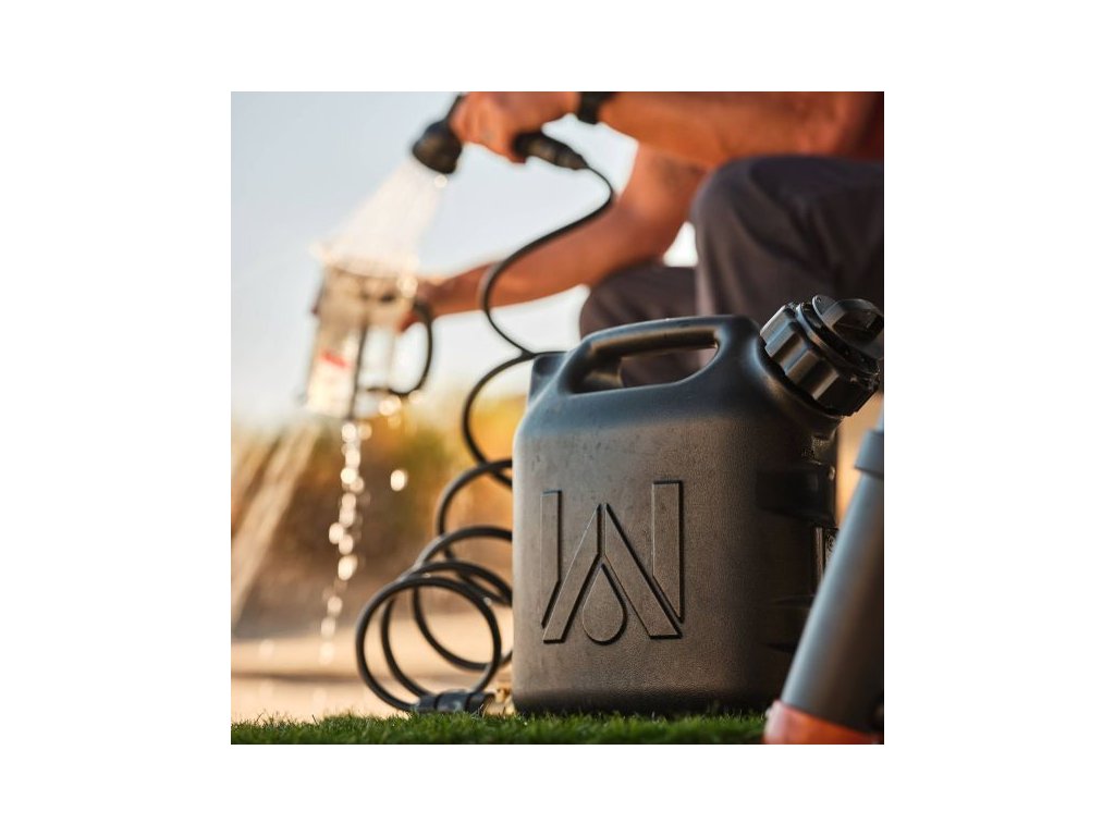 Součástí balení je vysokotlaká stříkací hlavice s pěti režimy proudu – od jemné mlhy až po silný tlakový proud. Nádrž je kompatibilní s dalším příslušenstvím WaterPORT, včetně držáku sprchy s pohybovým senzorem, který umožňuje hands-free použití – ideální například pro sprchování nebo oplachování nádobí.