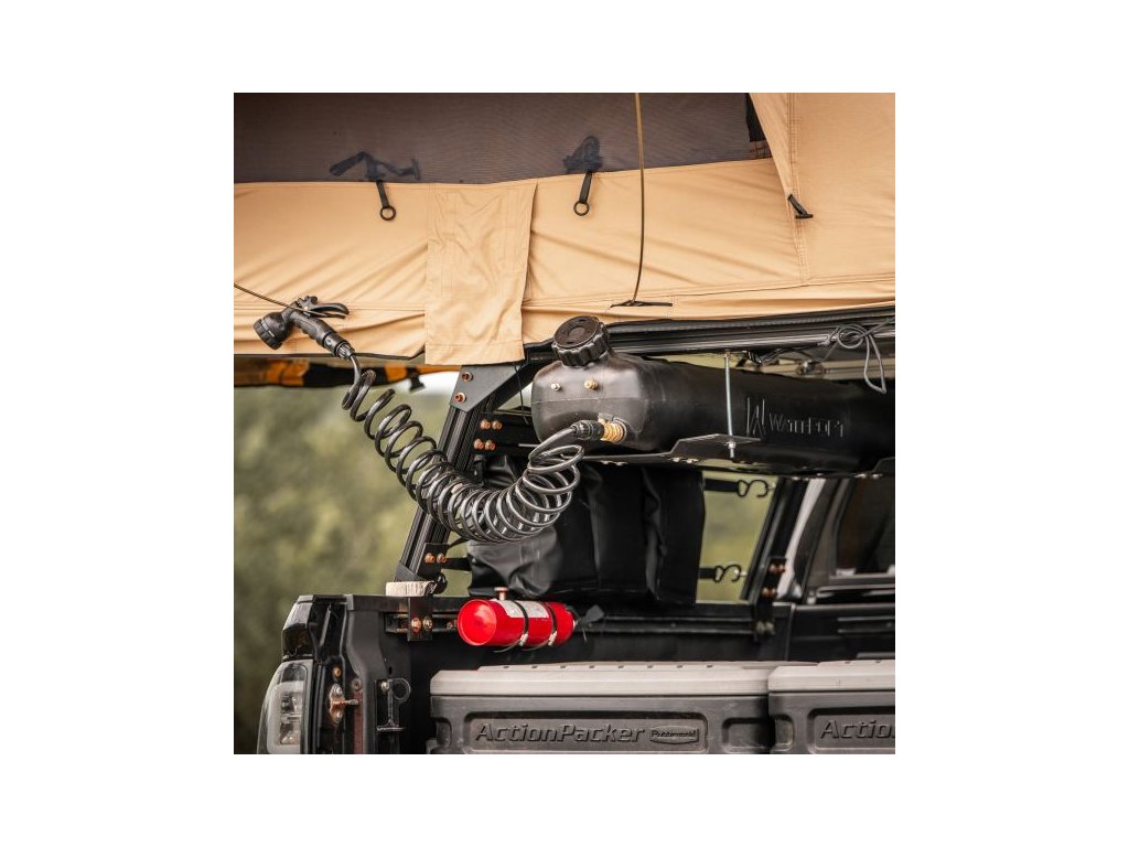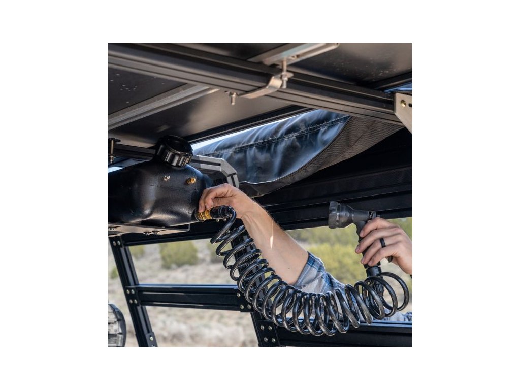 Součástí nádrže je vysokotlaká stříkací hlavice s pěti režimy proudu – od jemného mlžení až po silný proud. To umožňuje efektivní využití vody přesně podle potřeby. Nádrž je plně kompatibilní s příslušenstvím WaterPORT, jako jsou sprchové sety, pumpovací víko nebo držáky pro různé typy vozidel.